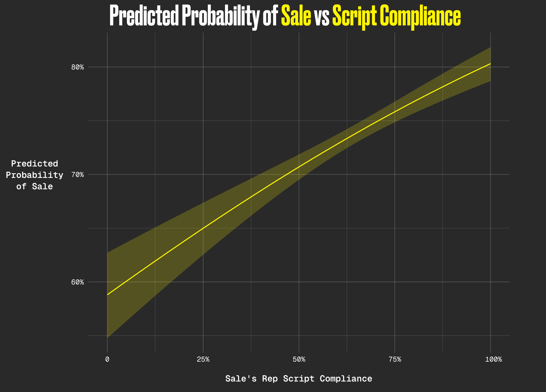 This visualization shows that higher script compliance is associated with meaningfully improved close rates. Reps following the script roughly 75% of the time achieve predicted success rates above 75%, compared to approximately 65% for reps following the script only 25% of the time.